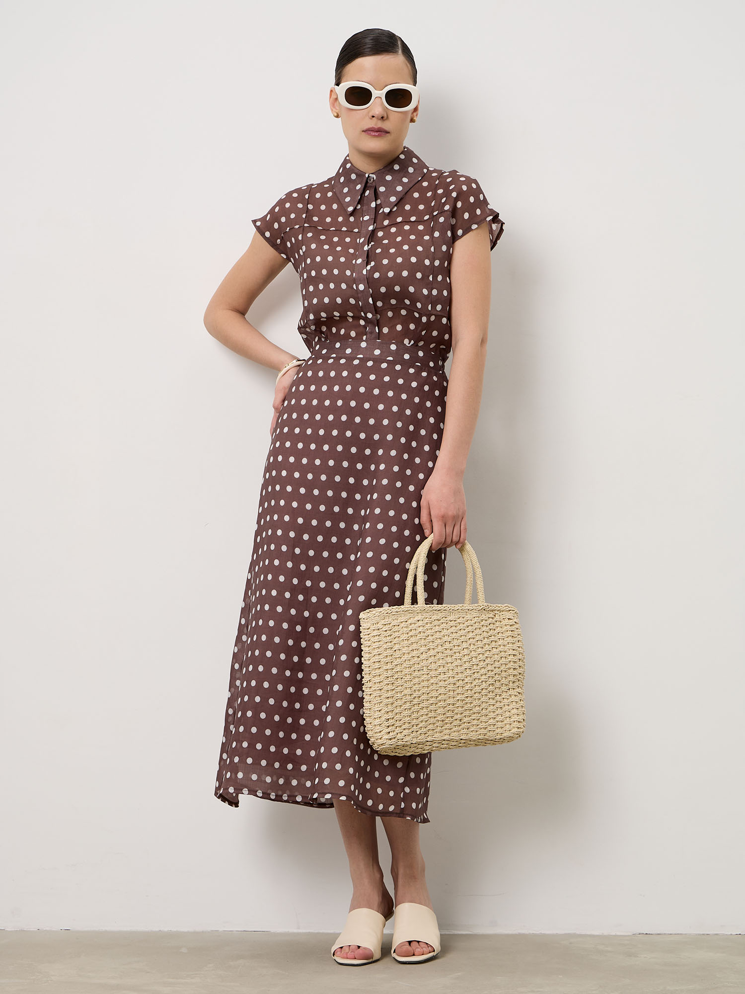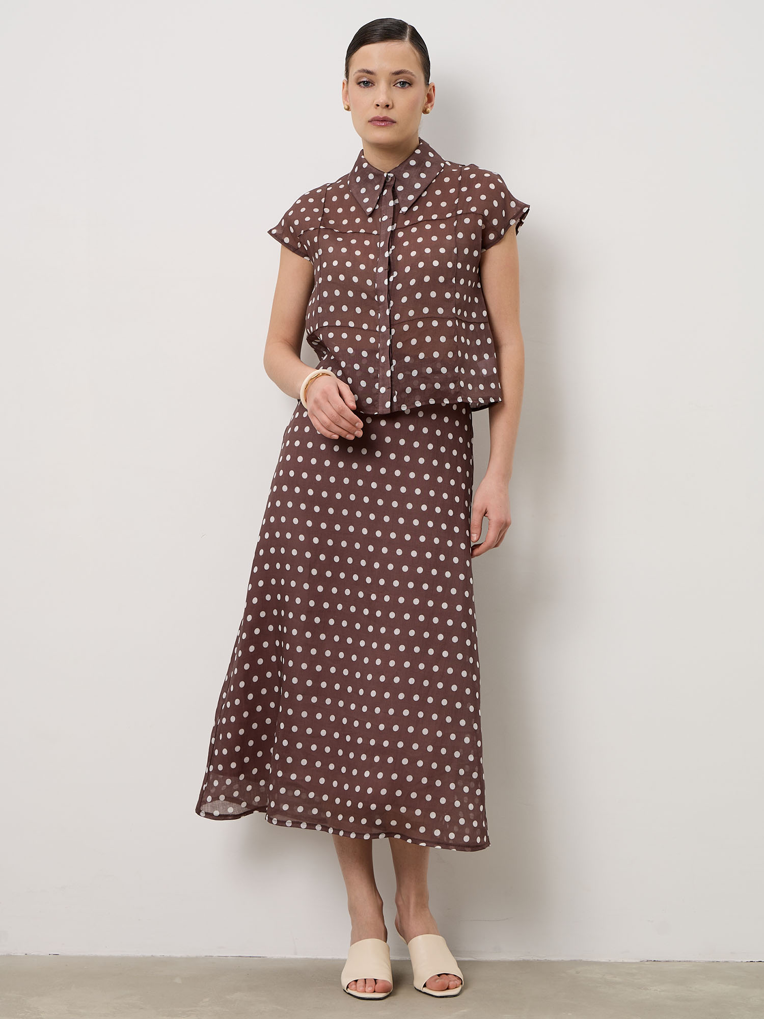 Коричневый фон с контрастным светлым горошком — элегантное сочетание, которое добавляет образу глубину и делает его выразительным.