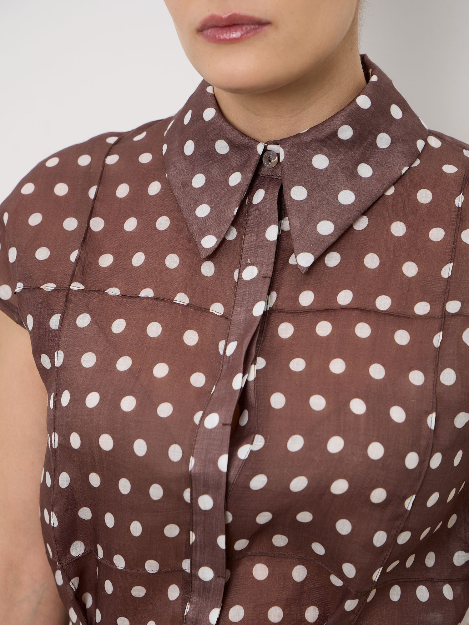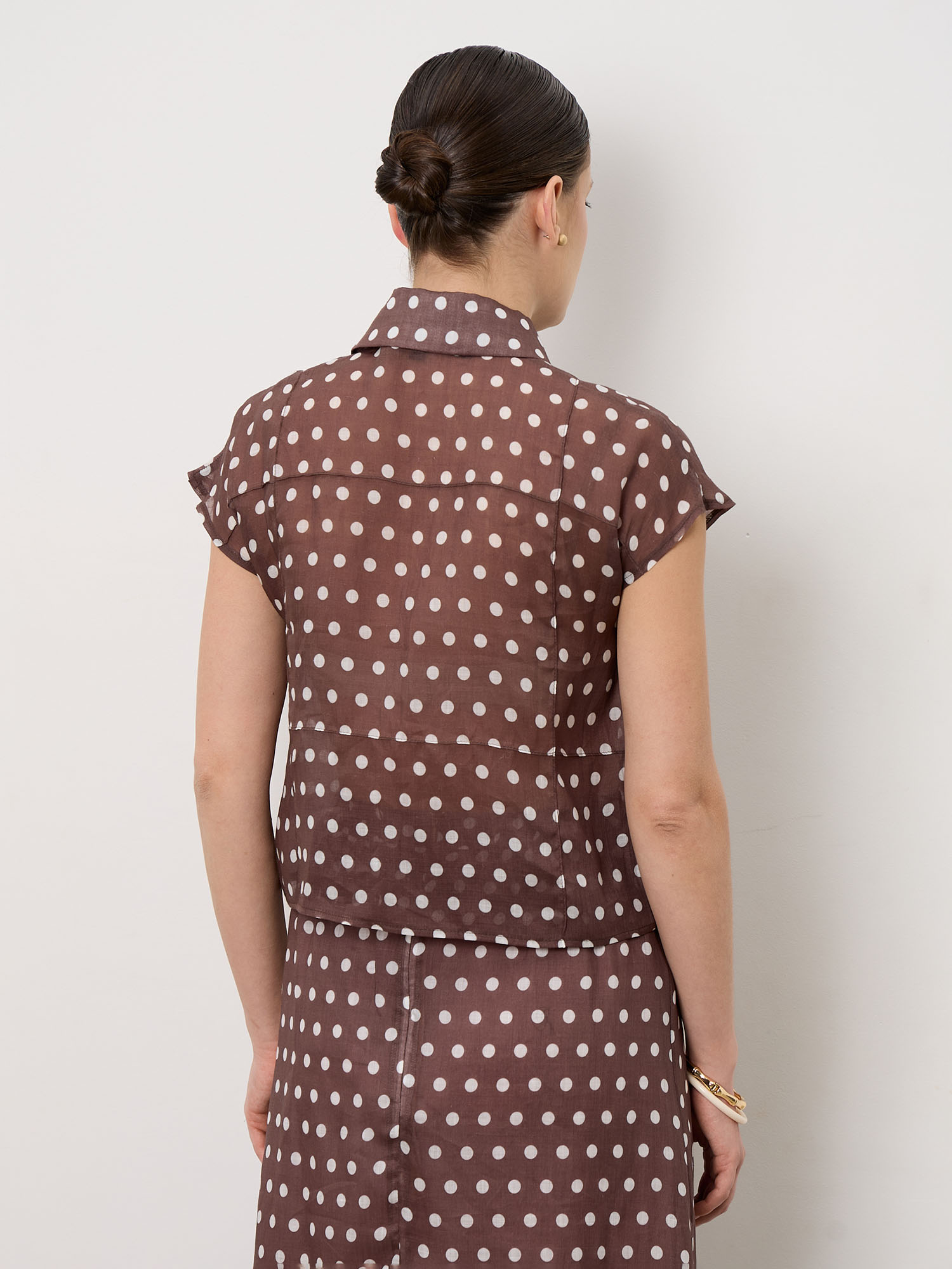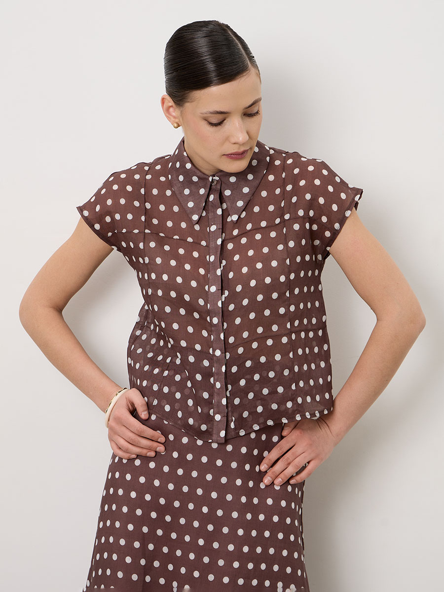 Лаконичный крой с короткими рукавами и аккуратной линией плеч. Классический принт в горошек придаёт модели выразительность и лёгкий ретро-характер. Блуза красиво сочетается с юбкой из той же ткани, создавая гармоничный комплект.