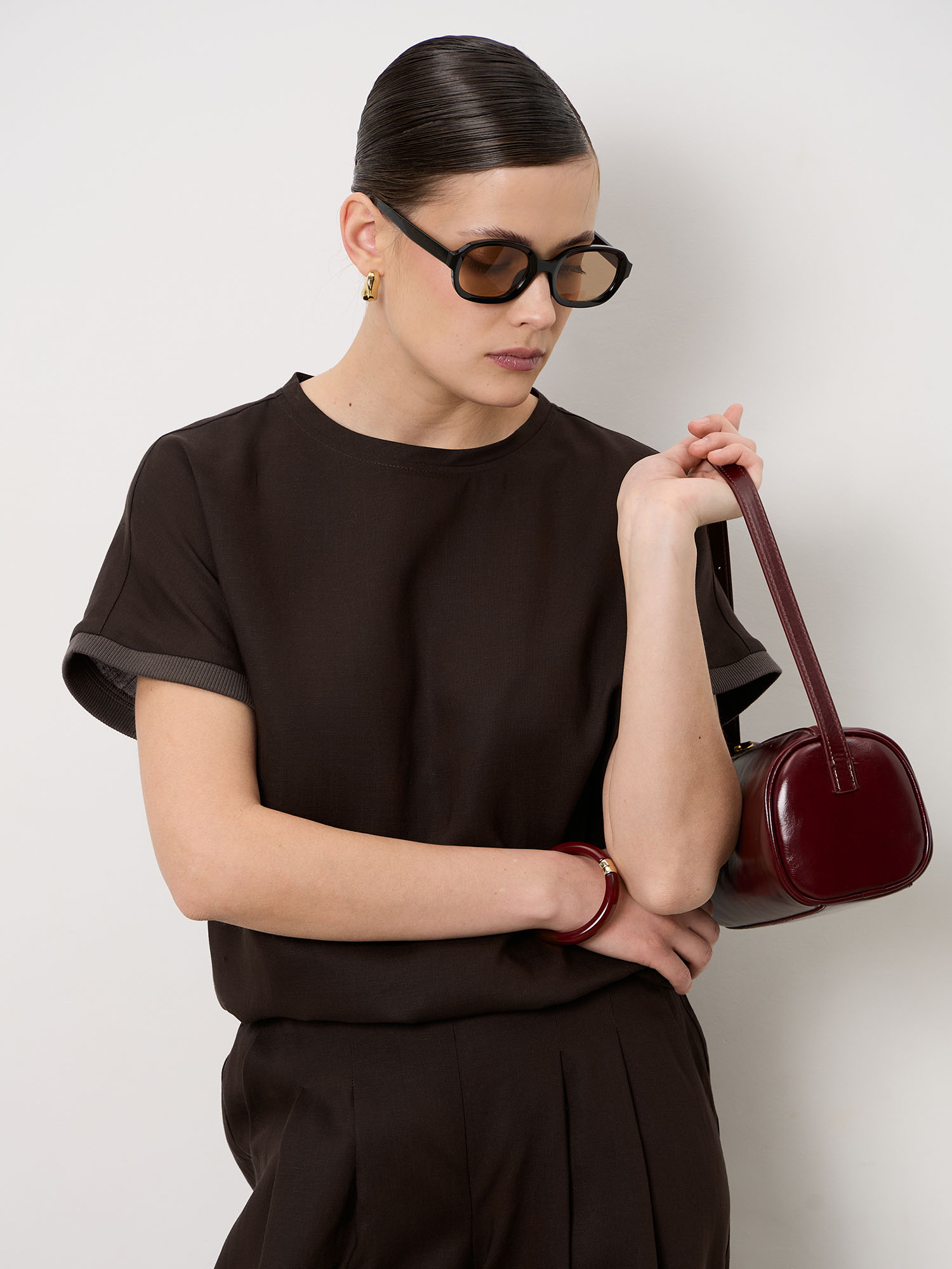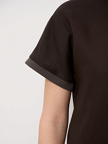 Модель выполнена в минималистичном стиле с аккуратным круглым вырезом и короткими рукавами с лёгким подворотом. Чистые линии и отсутствие лишних деталей делают топ универсальной базой для различных образов.