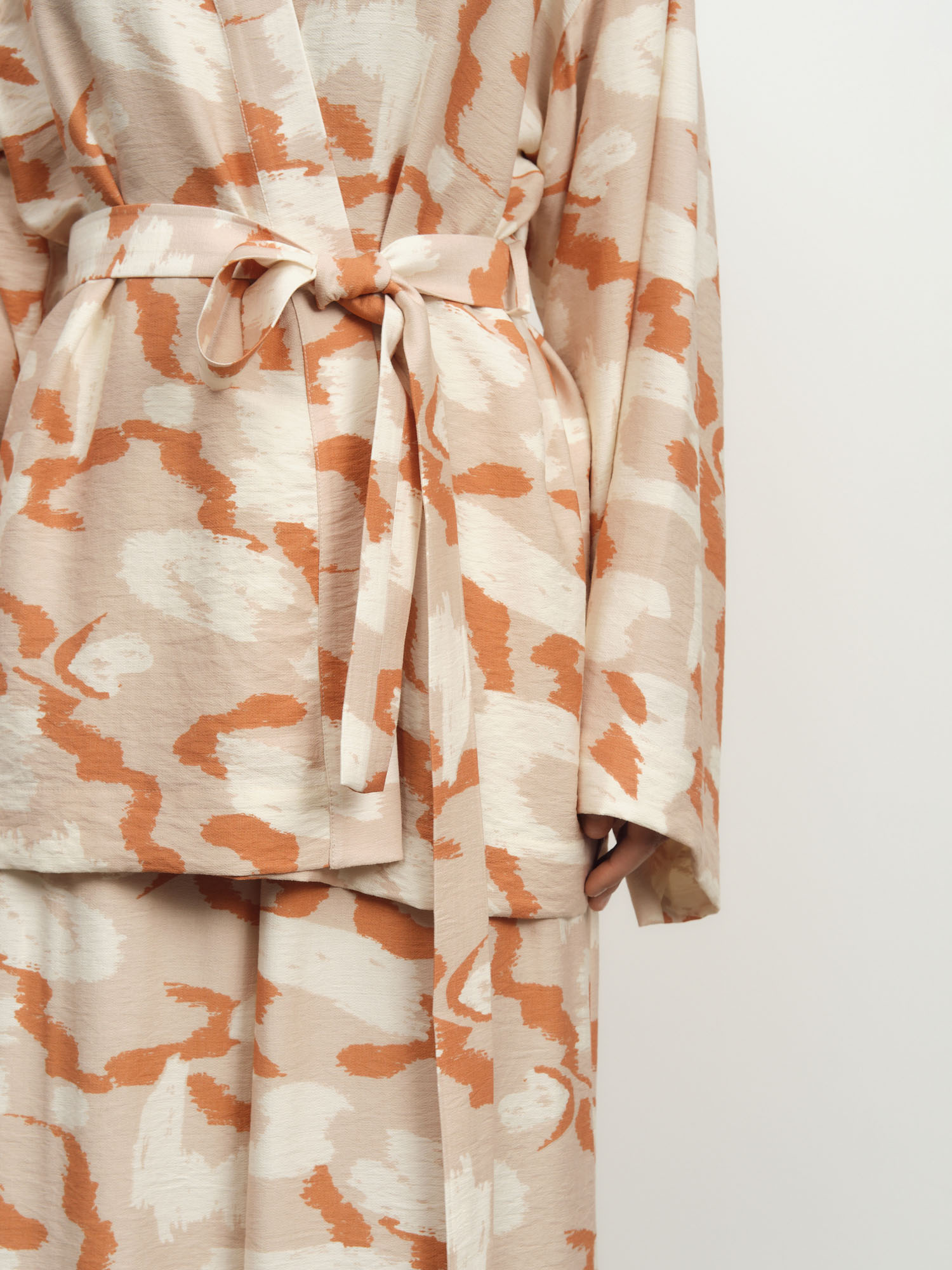 Свободный силуэт в стиле кимоно с запахом. Лаконичный крой дополняется динамичным рисунком, создающим эффектный образ.
