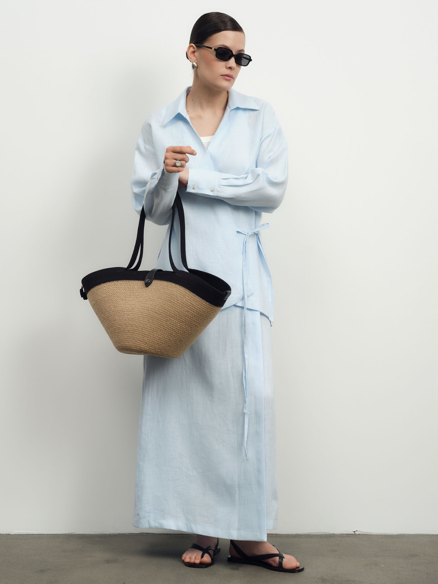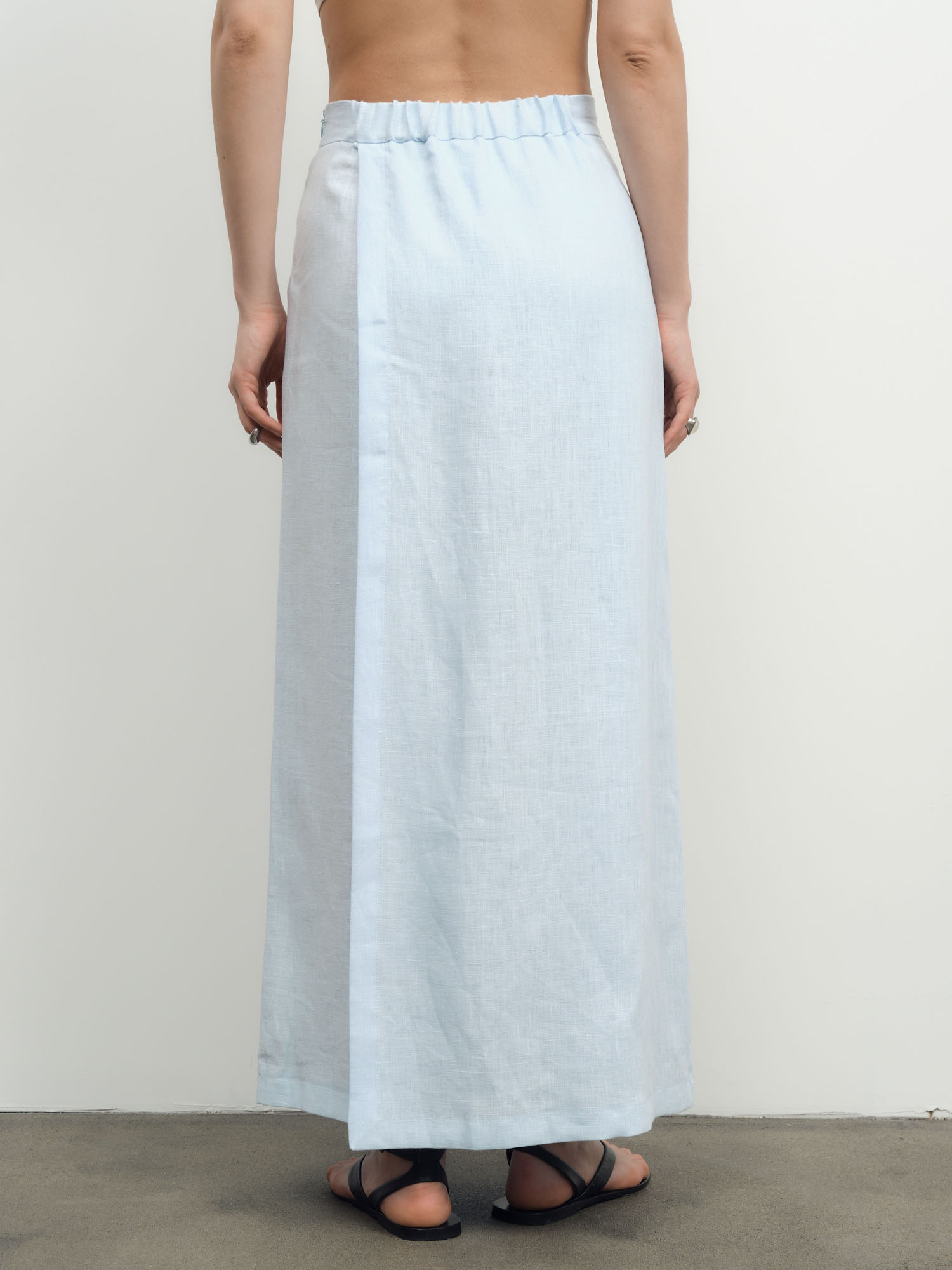 Юбка-брюки из льна — легкая и элегантная модель, сочетающая женственность юбки и удобство брюк. Отлично подходит для летнего гардероба и создания свежих образов. Материал: 100% лен — натуральный дышащий материал, обеспечивающий комфорт даже в жаркую погоду. Прочный, экологичный и приятный к телу. Дизайн: Свободный расклешенный силуэт с эффектом юбки. Конструкция модели обеспечивает свободу движений и визуальную легкость. Цвет: Голубой — нежный и освежающий оттенок, придающий образу легкость и воздушность. Детали: Модель с запахом спереди и сзади, аккуратная посадка по талии, мягкие складки, легкая фактурная ткань, скрытая конструкция брюк. Стиль и сочетания: Идеально сочетается с льняными рубашками, топами и базовым трикотажем. Подходит для повседневных образов, отдыха и летних прогулок. Уход: Рекомендуется деликатная стирка при низкой температуре. Сушить в расправленном виде, гладить с паром при средней температуре, допускается естественная помятость льна.